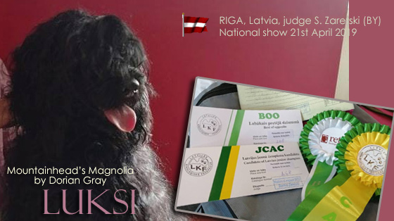 ![]() Rauma Finland, judge J. Janek (SLV), All-breed show on 18th May 2019 Mountainhead's Mila by Dorian Gray, BB2, reCAC, BOS-junior Mynämäki Finlande, judge V. Lahokoski (FI), All-breed show on 19th May 2019 Mountainhead's Mila by Dorian Gray, BB2, CAC |